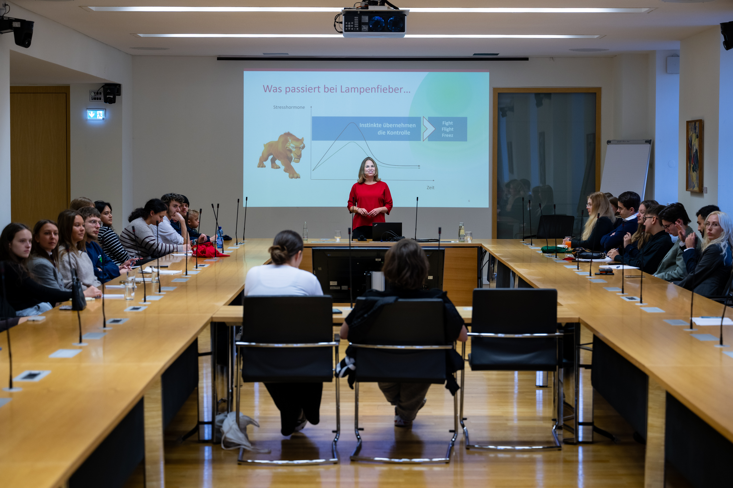 Im Anschluss begannen für die jungen Menschen die Praxistrainings. Da immer zwei parallel stattfanden, mussten sie sich im Vorfeld für eines entscheiden – was vielen bei der Themenfülle sichtlich schwerfiel. Bei Kommunikationstrainerin Dagmar D’Alessi ging es beispielsweise um ein sicheres und souveränes Auftreten. „Nur weil jemand im Publikum auf sein Handy schaut oder die Stirn runzelt, sollten wir nicht gleich einen Fluchtreflex bekommen“, erklärte sie.