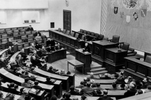 After the Second World War, democratic parties were allowed again by the American military government. On 26 February, an "Advisory State Committee" met in the assembly hall of Munich University as a pre-parliament. At that time, Dr Wilhelm Hoegner had been installed as Minister-President by the military government. Then, on 30 June, a Constitutional State Assembly was elected for the first time in Bavaria’s history. It was made up of members of the CSU, SPD, FDP and KPD parties. With the creation of the Bavarian Senate, the Bavarian tradition of the two-chamber system was taken up again. On 1 December, the people approved the new constitution and elected a new State Parliament at the same time. Since the old State Parliament building on Prannerstraße had been completely destroyed, the newly elected Parliament initially met at Munich University, at the Brunnenhof Theatre of the Munich Residenz and in the Sophiensaal hall of the Regional Tax Office.